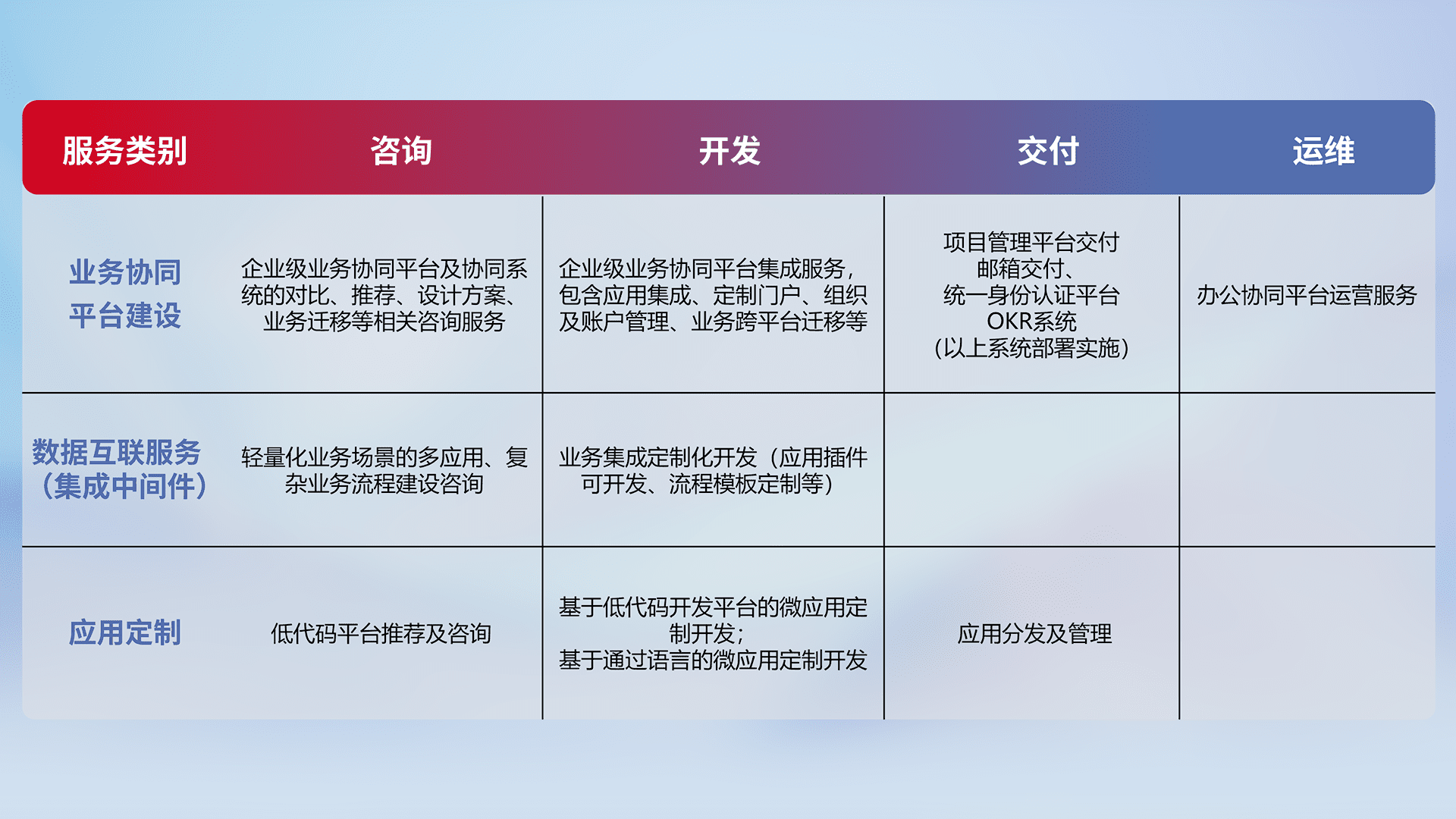 针对钉钉、、、、企微、、IDaas等平台级产品提供产品的规划、、、、方案、、、交付、、定制化开发等服务,,,实现如统一协同办公、、、、智能客户服务、、混合会议管理、、、智能数据查询、、、等业务场景,,,实现数字化转型。。