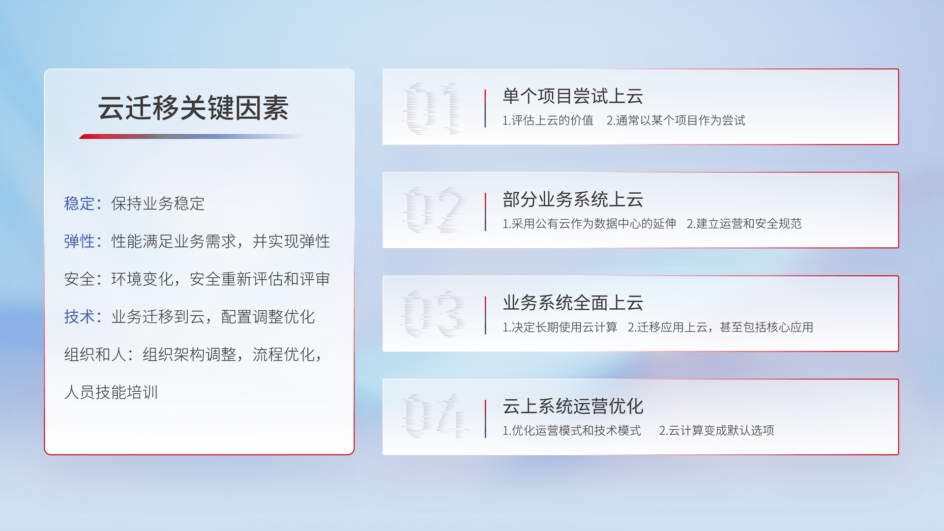 结合实际业务,,,,从规划设计、、、、云平台选型、、、云原生改造、、、数据迁移、、、集成交付,,,迁移全过程为客户识别最佳上云路径,,,做好风险识别管理,,,,设计网络架构、、、、身份权限、、、安全审计合规、、、操作审计、、、日志审计、、监控告警策略、、多站点容灾设计等,,,对云上基础设施进行整体规划,,,,提升IT治理水平,,以满足弹性、、、高可用、、高性能的需求。。