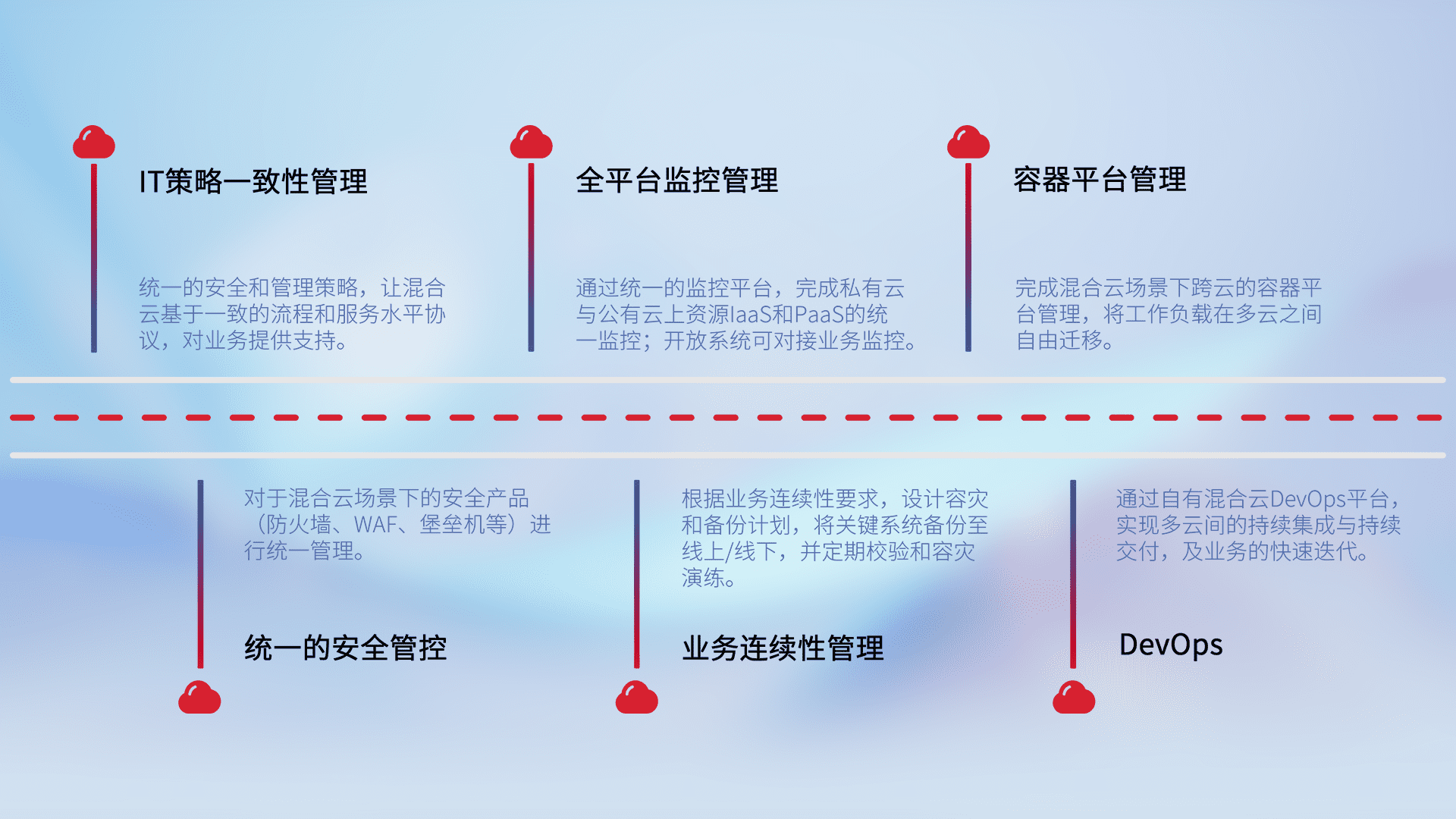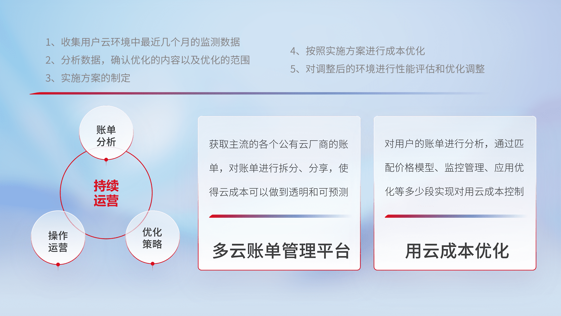 通过多云纳管,,,,以统一的资源数据模型把客户的云资源进行抽象和封装,,,进而实现对多云资源的统一操作,,,保障云资源管理的可靠性、、、、稳定性与可用性。。。量身定制化运维内容,,,,配置、、、、开发运维、、、、补丁管理、、、、备份、、、监控、、、认证和访问管理、、、审计和日常巡检等,,保障在用云过程中的可靠度,,稳定度以及高可用率。。。。